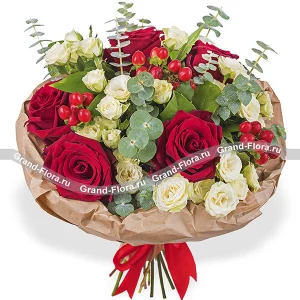 Цветочный рай - вип букет с красными розами и эвкалиптом