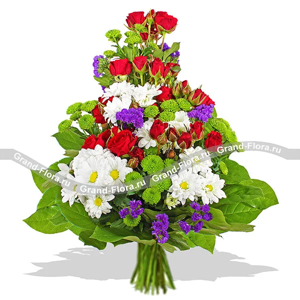 Стандартный (на фото): хризантема белая кустовая - 3 шт., роза красная кустовая - 4шт., хризантема зеленая кустовая - 4 шт., статица - 3шт., салал, сетка.