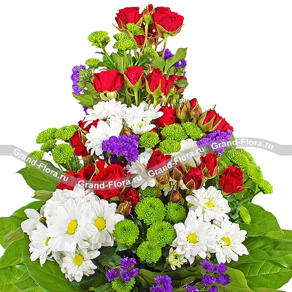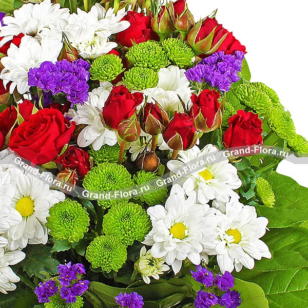 ДЕЛЮКС: хризантема белая кустовая - 7 шт., роза красная кустовая - 7 шт., хризантема зеленая кустовая - 6 шт., статица - 5шт., салал, сетка.