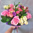 ЛЮКС (на фото): роза розовая - 7 шт, роза кустовая розовая - 2 шт, роза кустовая белая - 1 шт, фрезия(альстромерия) фиолетовая - 2 шт, фрезия(альстромерия) белая - 2 шт, эустома белая - 3 шт, декоративная зелень, фетр фиолетовый. Примерный размер: 35Х35 см.