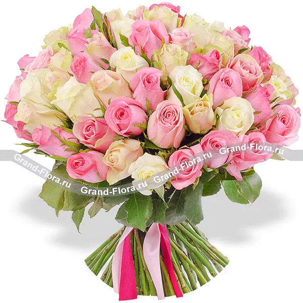 Роза белая и розовая - 101 шт., лента.