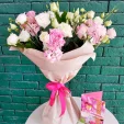 Уменьшенный: эустома розовая - 3 шт., эустома белая - 4 шт., декоративная зелень, упаковка крафт, лента розовая.