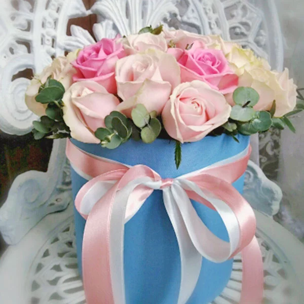11 роз: роза розовая (Россия) 50 см.,- 11 шт., коробка круглая маленькая (15*20) - 1 шт., эвкалипт, оазис.