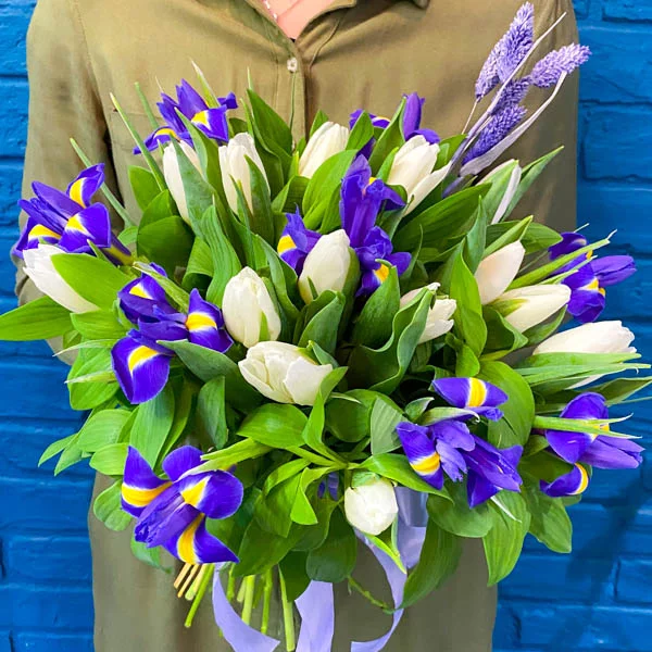 Букет из белых тюльпанов и ирисов – это изысканное сочетание элегантности и утонченности. Белые тюльпаны символизируют чистоту, невинность и искренние чувства, а синие ирисы добавляют композиции глубину и загадочность. Вместе они создают гармоничный дуэт, который станет идеальным подарком для особенного случая или просто приятным сюрпризом для близкого человека. Такой букет наполнит пространство свежестью весеннего утра и подарит ощущение легкости и радости.