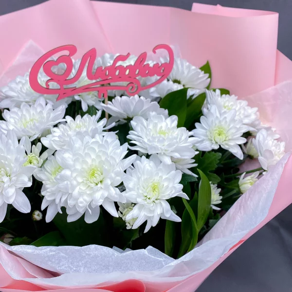 В центре композиции — пять белоснежных кустовых хризантем, которые символизируют чистоту, невинность и искренность. Они окружены зеленью рускуса, добавляющего букету объём и текстуру.